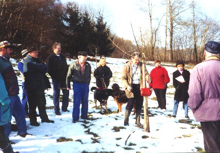 Baumschnittkurs stieß auf große Resonanz Erstmalig fand am Samstag, den 22.02.03, ein Schnittkurs für Bäume und Sträucher in Darsberg statt. Pünktlich um 13:30 Uhr fanden sich ca. 30 Teilnehmer am vereinbarten Treffpunkt ein, um sich in der Kunst der Baumerziehung bzw. Pflege unterweisen zu lassen. Nach einem kurzen Fußmarsch zum Baumgrundstück begrüßte Ortsvorsteher Hans-Peter Krieger gemeinsam mit Dieter Seewald Herrn Rittel aus Malschenberg als Kursleiter und die erfreulich große Anzahl Teilnehmer. Zunächst ging es an einen jungen Baum, der erst im Herbst 2002 gepflanzt wurde, um den sogenannten Erziehungsschnitt zu demonstrieren. Herr Rittel verstand es in humorvoller Art und Weise die Grundsätze dieser für den jungen Baum sehr wichtigen Maßnahme zu erläutern. Fachbegriffe, wie Baumstatik, Steigungswinkel der Haupt- und Nebenäste, ausgewogene Baumkrone und vieles mehr, wurden den Teilnehmern an bildhaften Beispielen erklärt. Einem vorwitzigen Teilnehmer, der sein Fachwissen nicht für