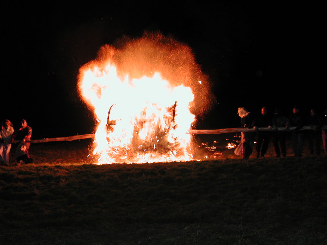 Viele Neckarsteinacher nutzten diesen schönen Nachmittag zu einer kleinen Wanderung nach Darsberg. Woher und womit auch immer die Schaulustigen und Erwartungsvollen Darsberg erreichten, wenn sie hungrig und durstig waren, wurden sie von den vielen Helfern in den Bewirtungszelten des SV Darsberg 1949 e.V. und der FFW Darsberg gastlich empfangen. Heiße Getränke, Bratwurst und die „heiße“ Feuerradwurst standen besonders hoch im Kurs. Wohl gestärkt konnten alle nun dem Rahmenprogramm folgen. Etwas abgewandelt war in diesem Jahr das Scheibenschießen. Erstmals hatten die größeren Kinder und Jugendlichen die Möglichkeit unter Anleitung die brennenden Scheiben in die Nacht zu schleudern. Die nun schon traditionelle Hexenparade wurde in diesem Jahr von einem ganzen Bus voller Hexen der Hirschhorner Hexenzunft unterstützt und auch die spontan angereisten wunderschön und phantasievoll geschminkte Hexengruppe aus Hemsbach machte den Zug interessanter und beeindruckender. Schwungvoll, lautstark und in prächtigen Kostümen begleiteten die „Neckarfurzer“ als Guggemusik das Hexentrieben vom „Alten Schulhaus“ bis zum Ortseingang, wo bereits das große Hexenfeuer entzündet war. Nach dem Konzert der Guggemusik und dem Hexentreiben am Fuße des Berges auf den das Feuerrad abgerollt wird, leuchteten 12 kleine Feuer (jedes brennt für einen Monat des Jahres) und markierten so den Weg des Feuerrades den Berg hinab. Bereits dieses Bild versetzte jeden, der es zuließ, in einen erwartungsvollen Spannungszustand. Das gesamte Jahr 2004 symbolisch an den Hang des Berges gezeichnet und das flammende Feuerrad als Symbol für die Sonne, welche uns das gesamte Jahr über begleiten wird, diese unbeschreibliche Schönheit und die damit verbundene gewaltige Kraft, zeigte einmal mehr unsere eigene „Kleinheit“.