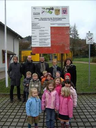 Über den Baubeginn am 1.12.2009 freuen sich (hinten v.l.n.r.): die Architekten Hr. Theis und Hr. Heemskerk, für den Ortsbeirat Darsberg Hr. Edelmann, für die Stadt Neckarsteinach 1. Stadträtin Fr. Hinz, für den Kindergarten Fr. Stoll und in den vorderen Reihen ganz besonders die Kinder. (Foto: Hr. Merscher, Stadt Neckarsteinach Hauptamt)